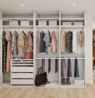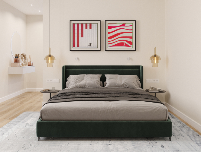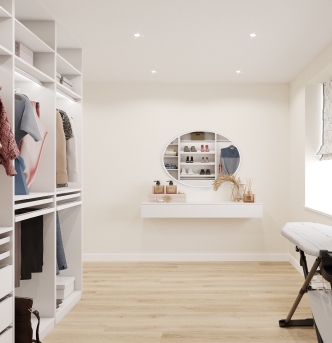 Площадь спальной комнаты позволило выделить внушительное место для организации гардероба