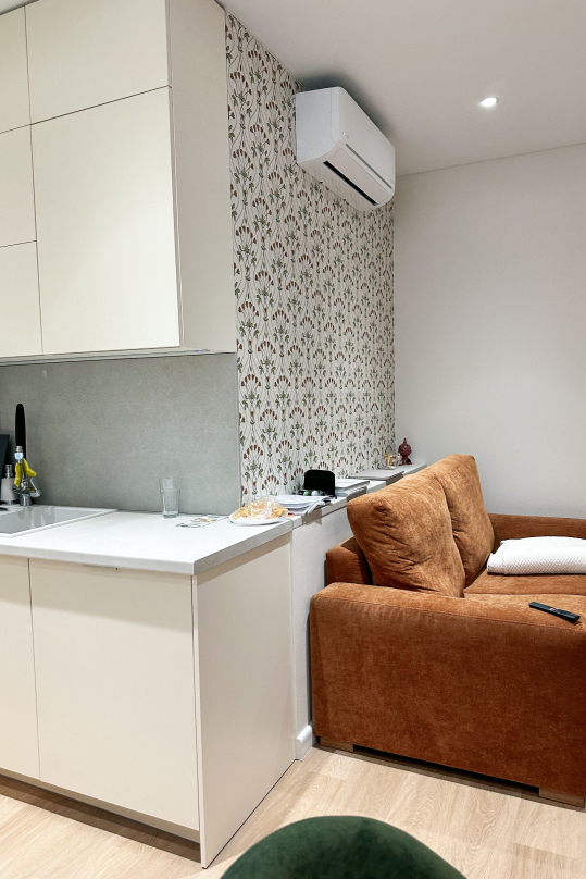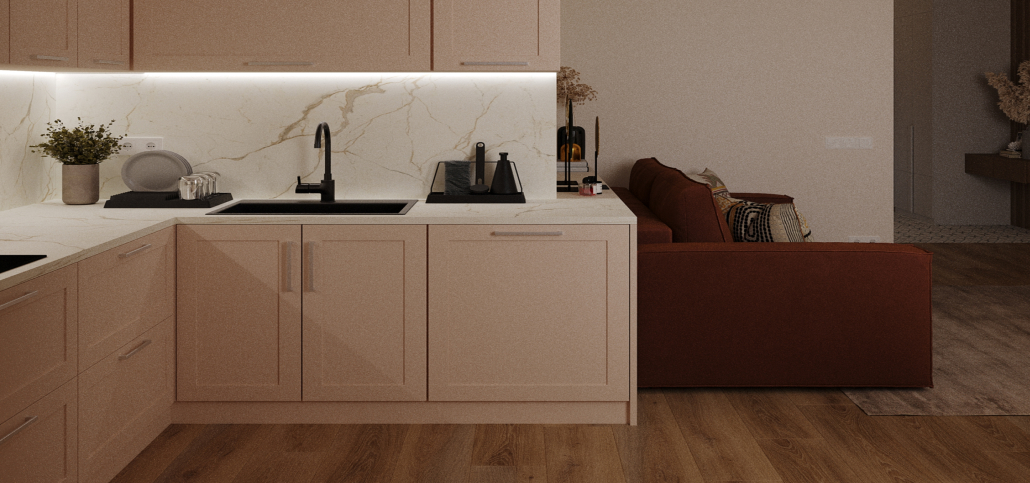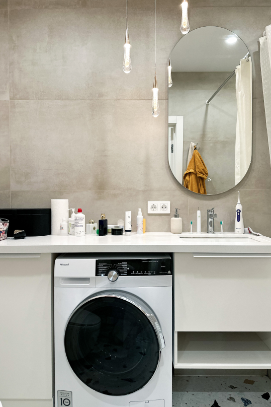 Переиграли взгляд застройщика на расположение кухни, что позволило нам выиграть пространство для гостиной, но при этом сохранить функциональность кухни