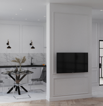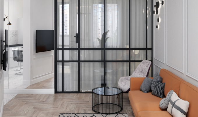 Нестандартная форма квартиры ставила некоторые рамки в разработке планировок, поэтому было принято решение организовать единое пространство