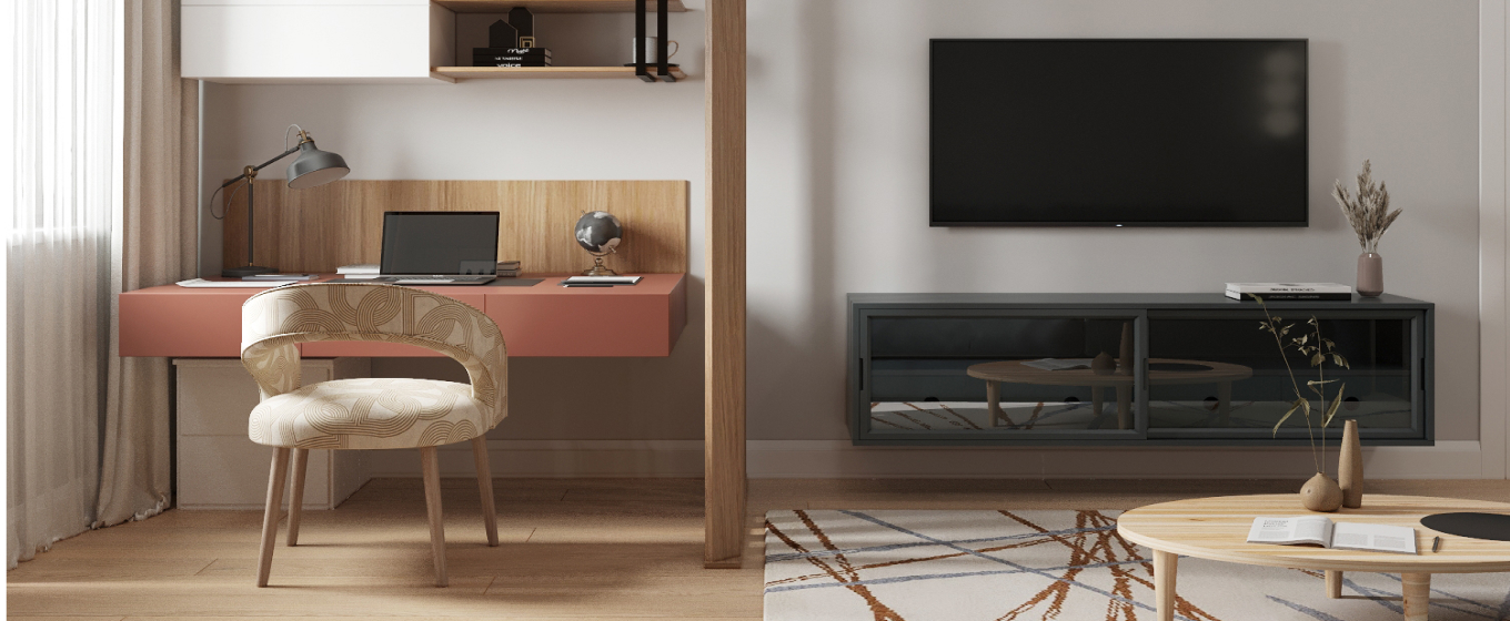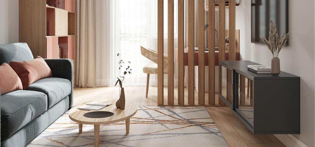 Зонирование гостиной комнаты позволило выделить отдельное рабочее место, сохранив при этом единое пространство